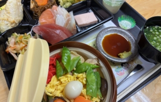 釜飯風ごはん 天ぷら(海老・鶏・舞茸・大葉・銀杏) すき焼き 赤魚西京漬焼 厚焼き玉子 刺身 千切りサラダ 胡麻豆腐 茶碗蒸し パインゼリー和え